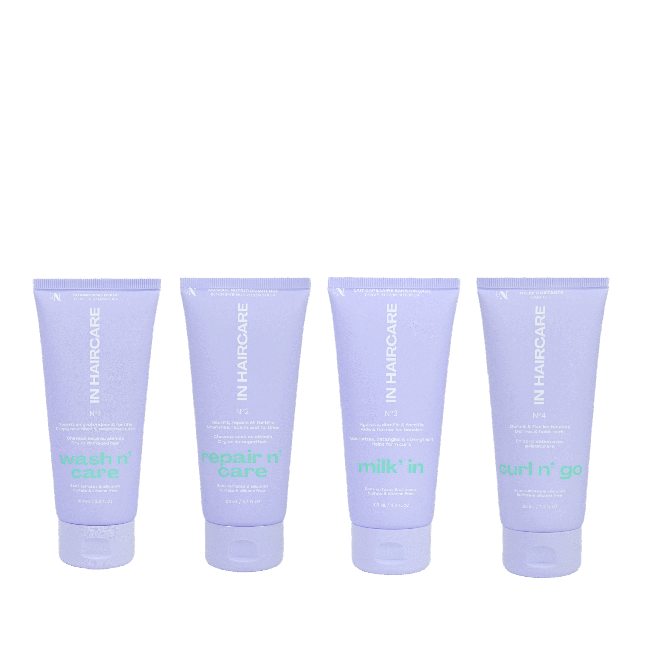 Shampoing doux, masque réparateur, lait hydratant et gelée définissante : tout ce qu’il faut pour des cheveux propres, nourris, hydratés et définis, même en voyage.
